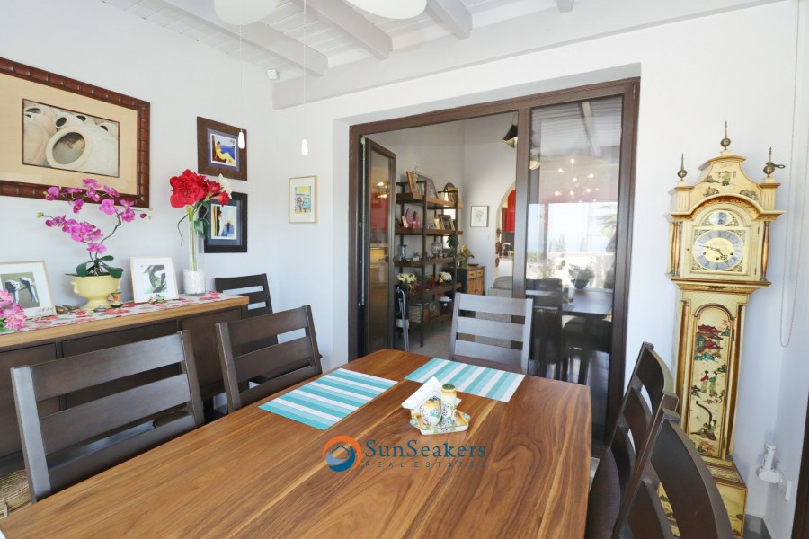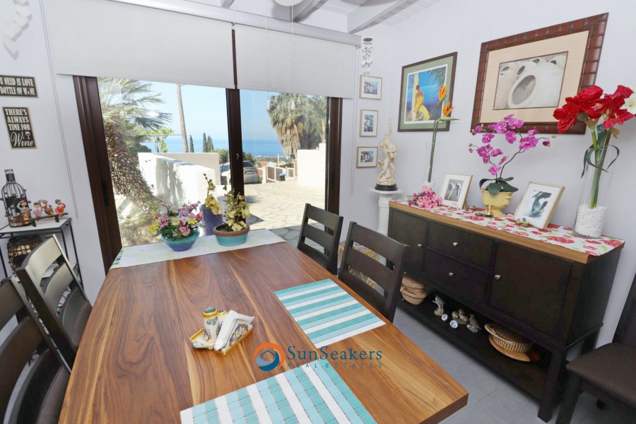 Upon entering the home, you are welcomed by a beautifully designed lounge area with a fireplace, creating a warm and elegant living space. Adjacent to this is the separate dining area, strategically positioned to enjoy lovely sea views as a stunning backdrop. The separate fully equipped kitchen is both stylish and practical, offering excellent space for everyday living.