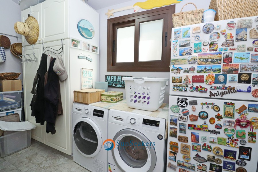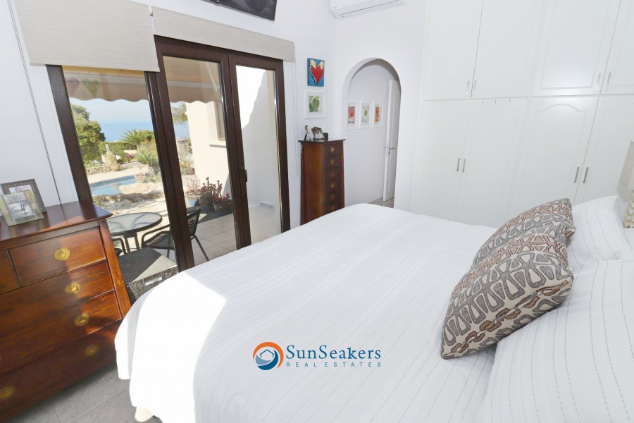 A beautiful hallway leads to the generous owner’s suite, complete with en-suite facilities and direct access to the outdoor areas, where pleasant sea and garden views continue the tranquil setting. A second spacious bedroom, a family bathroom, laundry / utility room, and extensive storage space complete the interior of the home.