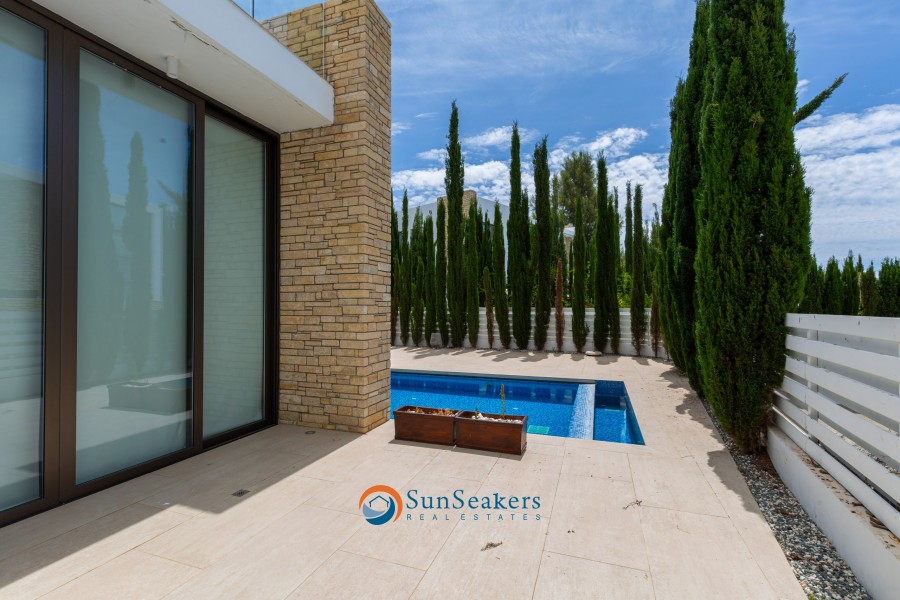 Set on a generous plot, the villa boasts spacious interiors with bright open-plan living areas, a fully equipped modern kitchen, and three well-appointed bedrooms, including a master suite with en-suite bathroom and private balcony. Large glass doors lead to a sun-drenched terrace, private swimming pool, landscaped garden, and outdoor dining area – perfect for entertaining or relaxing in complete privacy.