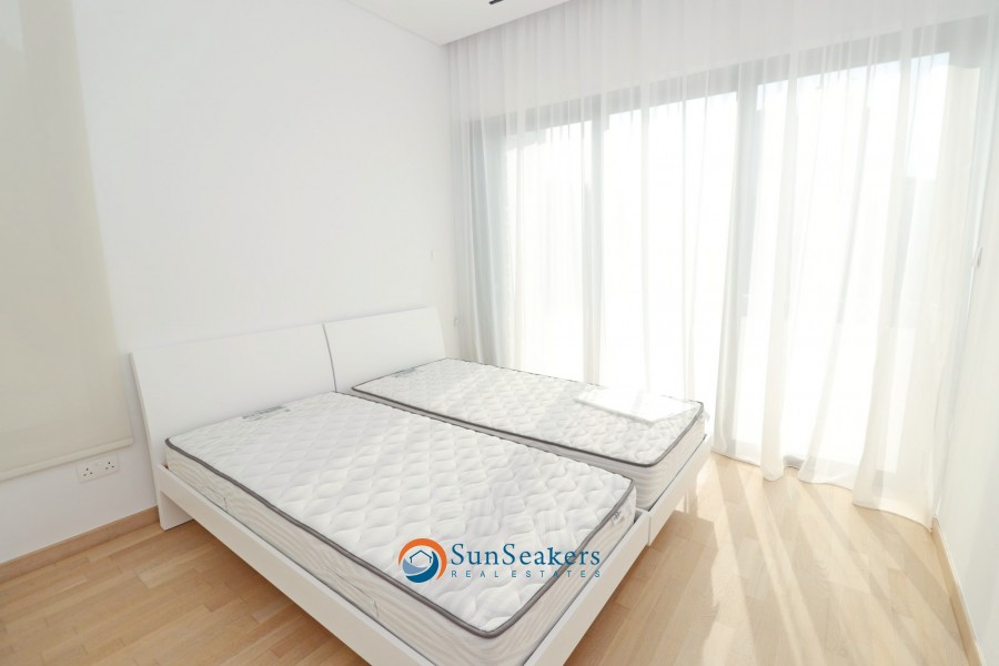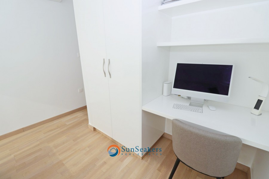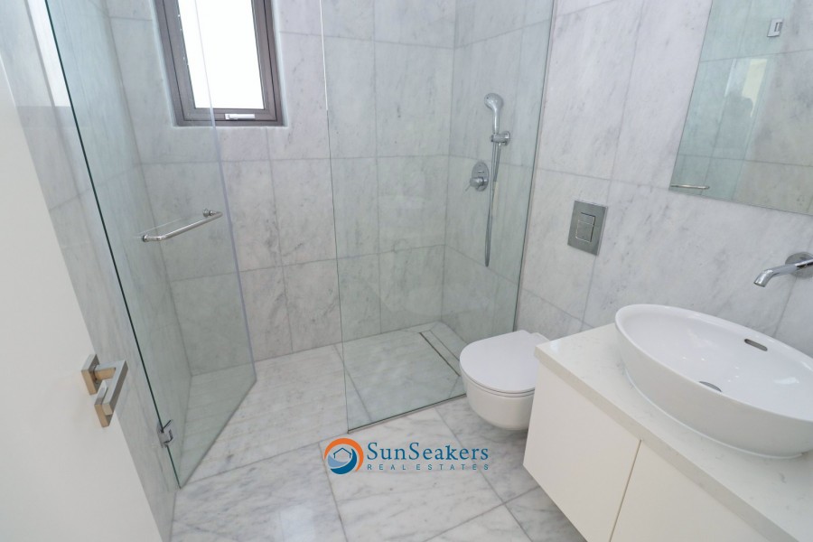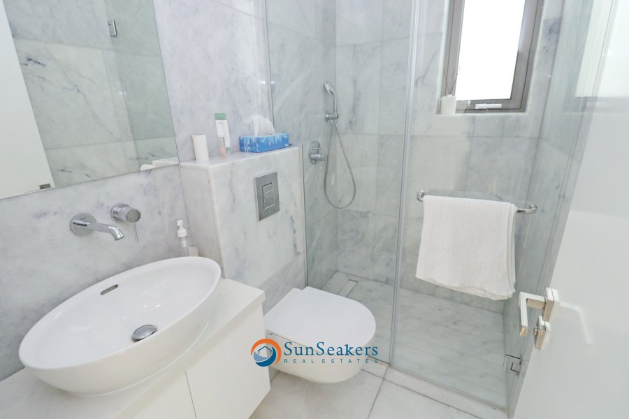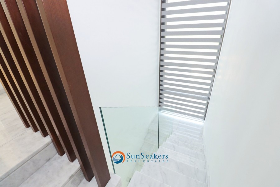 A beautifully designed staircase leads to the upper floor, where you will discover the expansive owner’s suite with its own en-suite bathroom, along with an additional junior suite, also featuring en-suite facilities. Both bedrooms have direct access to a large private balcony offering serene views of the pool, gardens, mountains, and some partial side sea views, providing the perfect place to unwind.