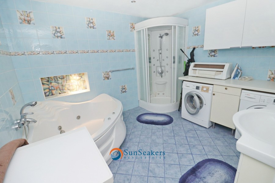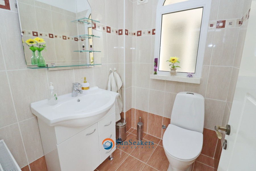 To the left, the generously sized fully equipped kitchen includes a breakfast area, designed for both everyday living and hosting guests. This floor also offers a comfortable double bedroom with en-suite facilities, including a bath and hydro massage shower, as well as a laundry room. The guest WC completes this floor.