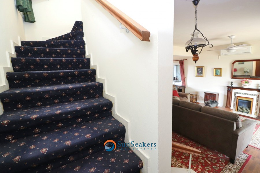 A staircase leads to the first floor, where you will find two spacious double bedrooms. Both bedrooms share a balcony overlooking the surrounding area, providing a pleasant outdoor space to enjoy the views.