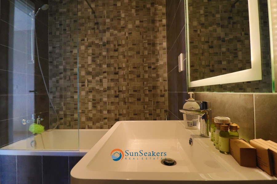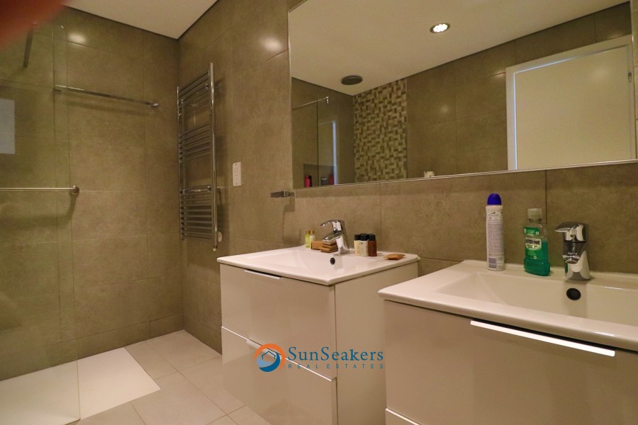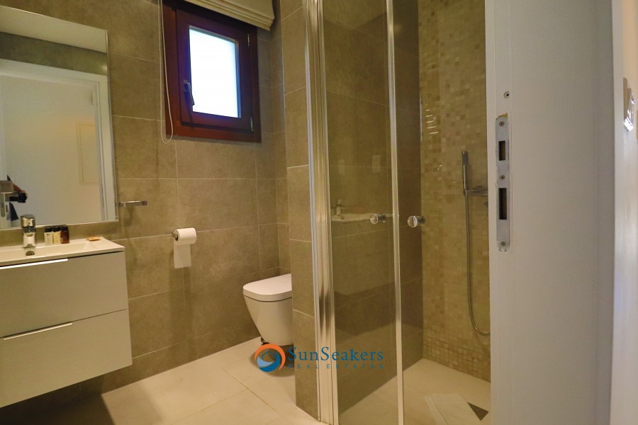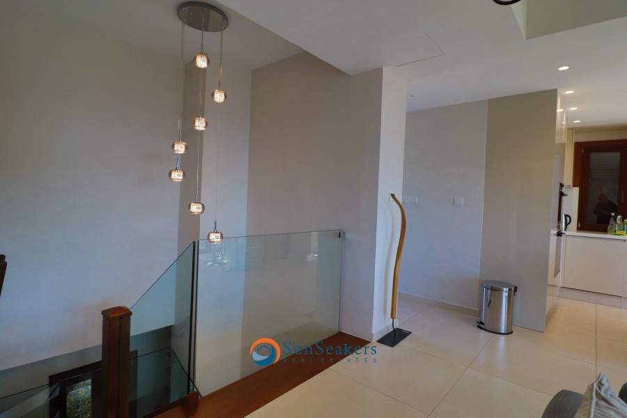 Upon entering, you're welcomed into a stunningly spacious open-plan living area with breathtaking views of the pool and the Mediterranean Sea. The bespoke modern kitchen features a central island and is fully equipped with the latest high-end appliances, making it both stylish and functional. On this level, you’ll also find a generously sized bedroom with a luxurious en-suite bathroom and a guest cloakroom.