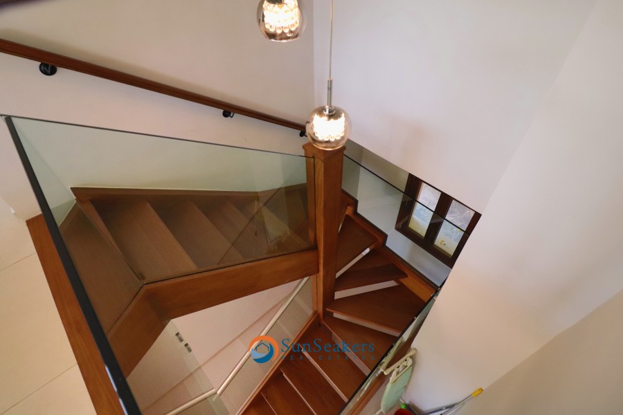 Descending a beautifully crafted wooden staircase, you’ll arrive at a second, fully equipped kitchen and storage area—ideal for extended living or entertaining. To the right, the expansive master suite boasts a walk-in wardrobe, an opulent en-suite bathroom, and a cozy sitting area overlooking the pool. To the left, two additional spacious bedrooms feature luxury fitted wardrobes and share a beautifully appointed bathroom.