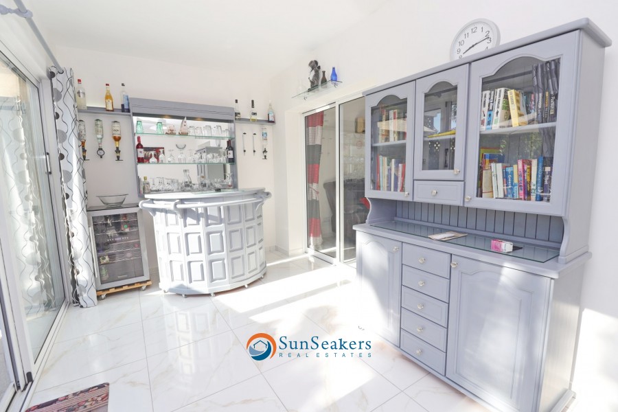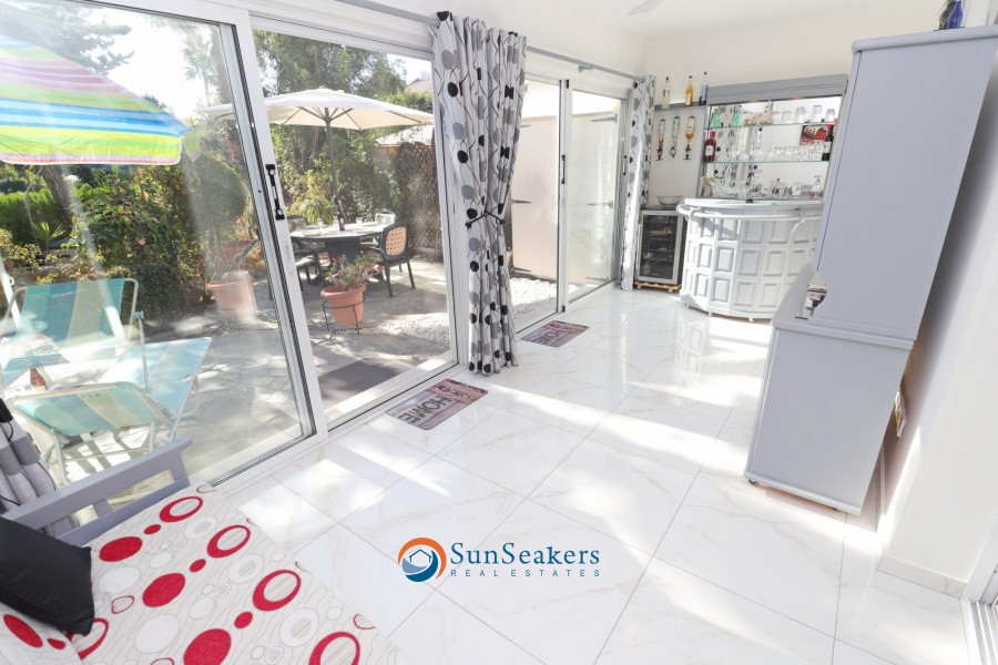The ground floor further unveils one of the home's standout features: a beautifully appointed sunroom. This versatile space offers an inviting retreat, complete with a custom-built bar and ample seating for both relaxation and entertaining. With large sliding windows, the sunroom seamlessly connects to the private outdoor garden area, where a well-designed sun lounging space and an al-fresco dining area await. This enchanting outdoor setting is ideal for soaking up the sun, unwinding with a good book, or hosting memorable gatherings with family and friends.