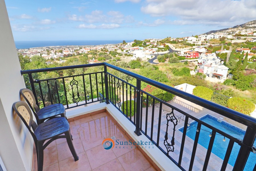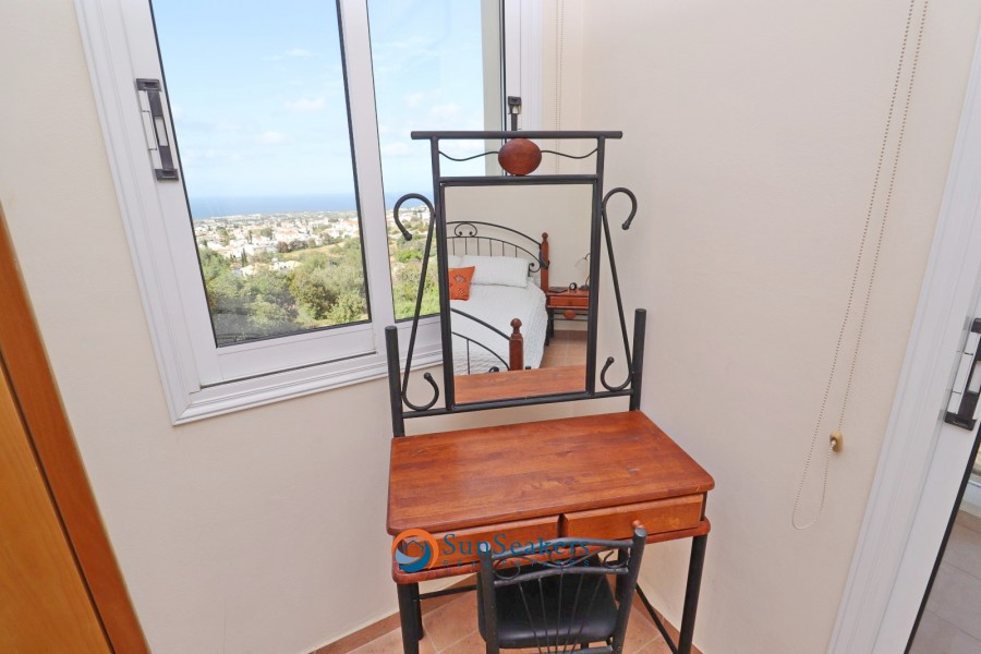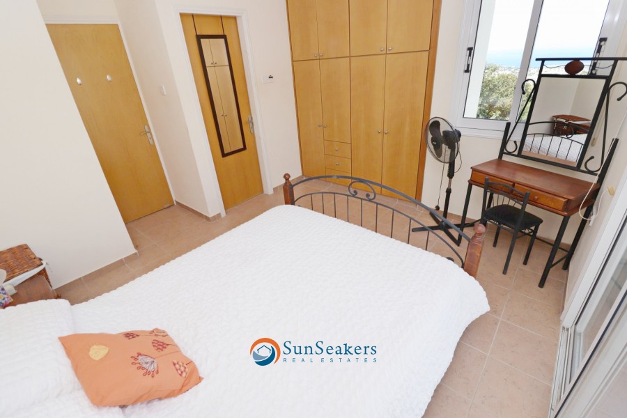 Upon entering, you are welcomed into a bright and airy open-plan living and dining area, bathed in natural light and thoughtfully designed for comfortable living. The fully equipped kitchen flows seamlessly onto a beautifully appointed veranda—an ideal setting for al fresco dining while enjoying the serene sea and mountain views. From here, a short set of stairs leads to the inviting communal swimming pool, perfect for refreshing dips under the Mediterranean sun.